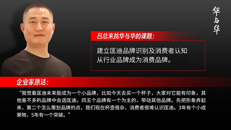 有了很雄厚的實(shí)力和很恰當(dāng)?shù)臅r(shí)機(jī),呂總就希望建一個(gè)品牌,讓人能夠知道他的匡迪,希望大家今天去買一個(gè)杯子,讓大家對匡迪能有印象。所以2023年來找華與華,開啟了匡迪的品牌建設(shè)之路。