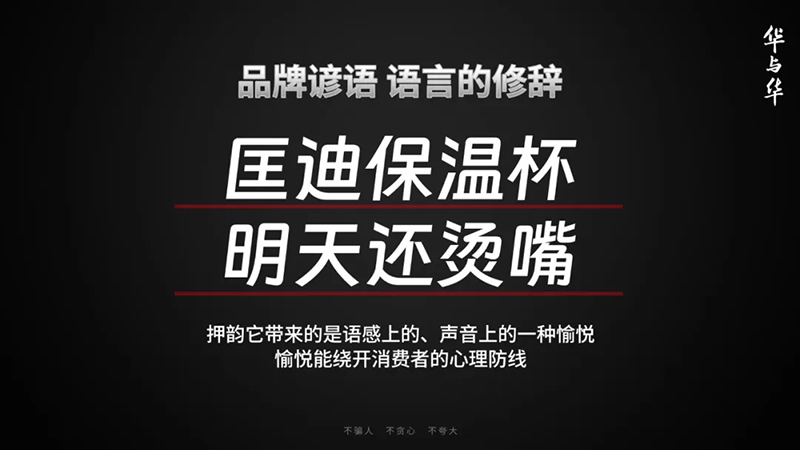“匡迪保溫杯,明天還燙嘴”也押韻,押韻就能創(chuàng)造一種愉悅,而這種愉悅,它就能繞開消費(fèi)者的心理防線。消費(fèi)者不僅接受了,還很開心,開開心心就能說給別人聽,讓它易于播傳。