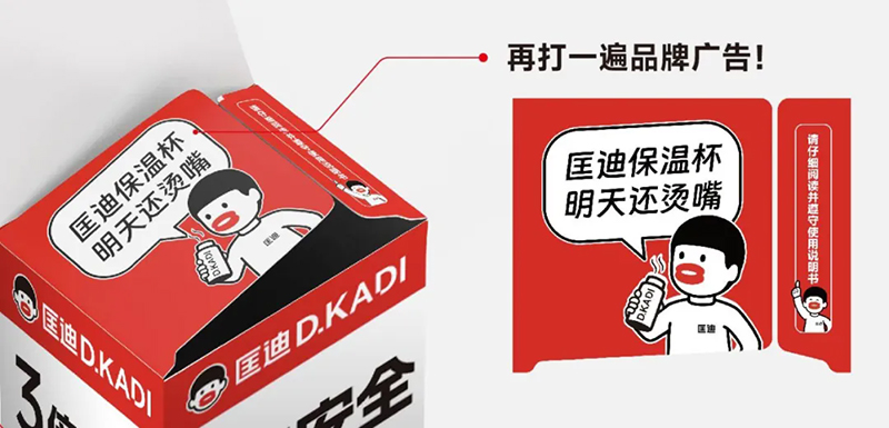 我們用“明天還燙嘴”這樣的修辭,來強(qiáng)調(diào)匡迪保溫杯保溫的性能——燙嘴!舌頭都燙痛了!這是一個(gè)有母體的場景,也是大家共同的經(jīng)歷經(jīng)驗(yàn)。而且很多保溫杯,本來就要貼個(gè)“小心燙嘴”的提示。