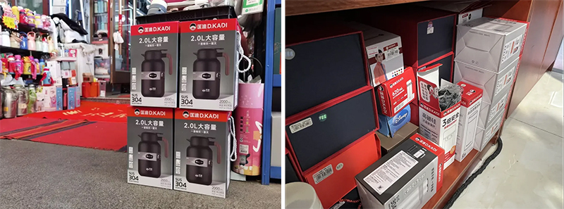 在門店里,我們發(fā)現(xiàn),保溫杯的陳列常常讓人眼花繚亂,品牌很難突出,店家就會把產(chǎn)品包裝當(dāng)成了陳列道具,堆放在店內(nèi)。所以,包裝本身又是終端陳列的道具,也是產(chǎn)品體驗(yàn)中的重要一環(huán)。
