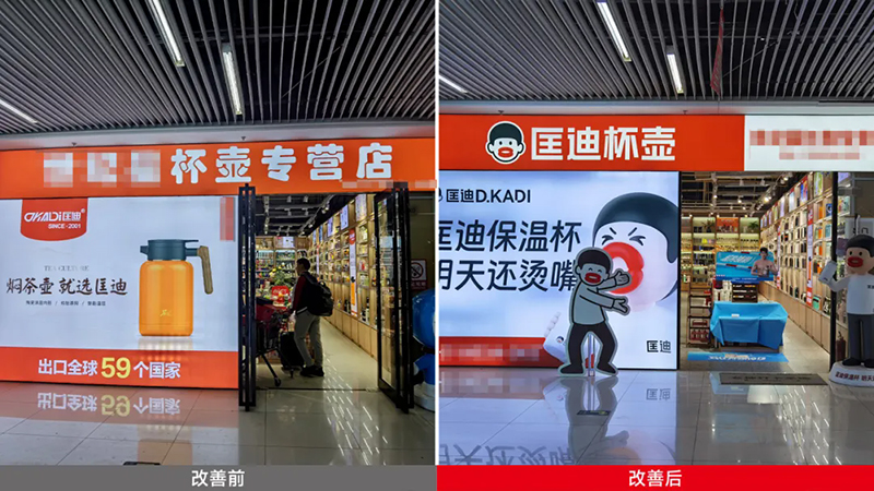 走進(jìn)門店,你會發(fā)現(xiàn)我們把原來的貨架改造成了“發(fā)光海報(bào)”,匡迪的標(biāo)志、燙嘴哥形象和企業(yè)背書全都亮在那里,讓人不由自主想進(jìn)店一探究竟。
