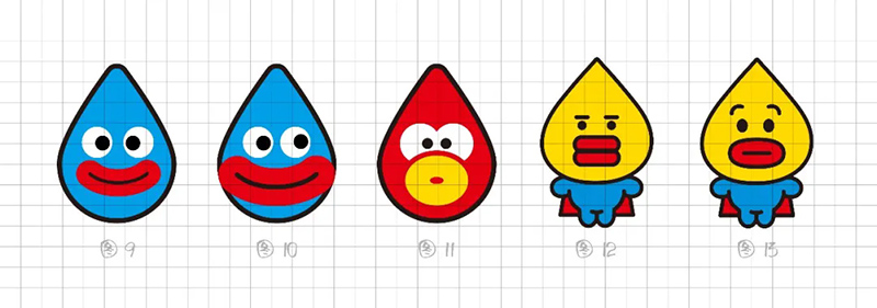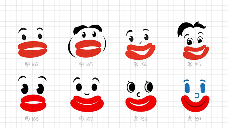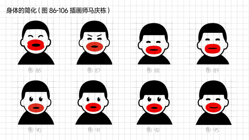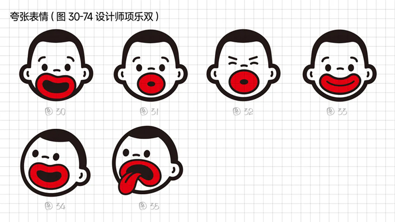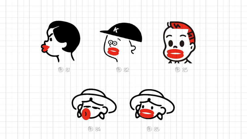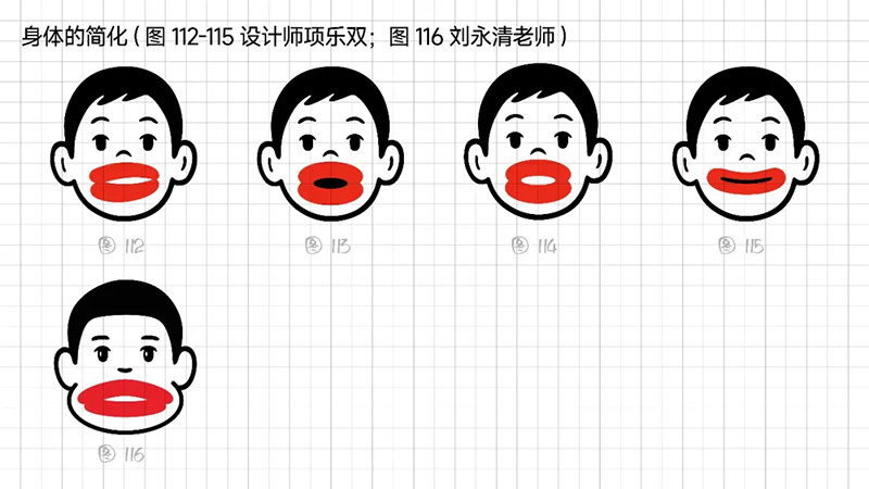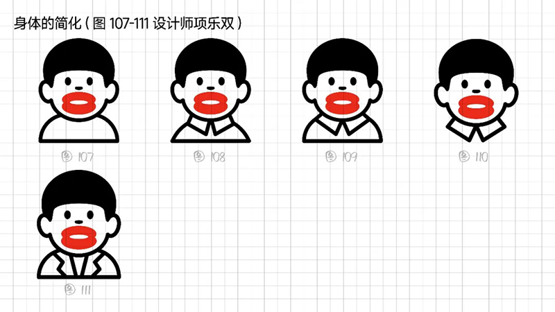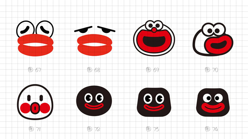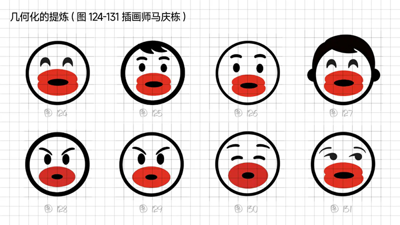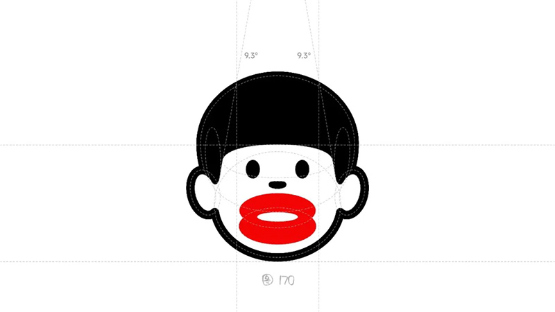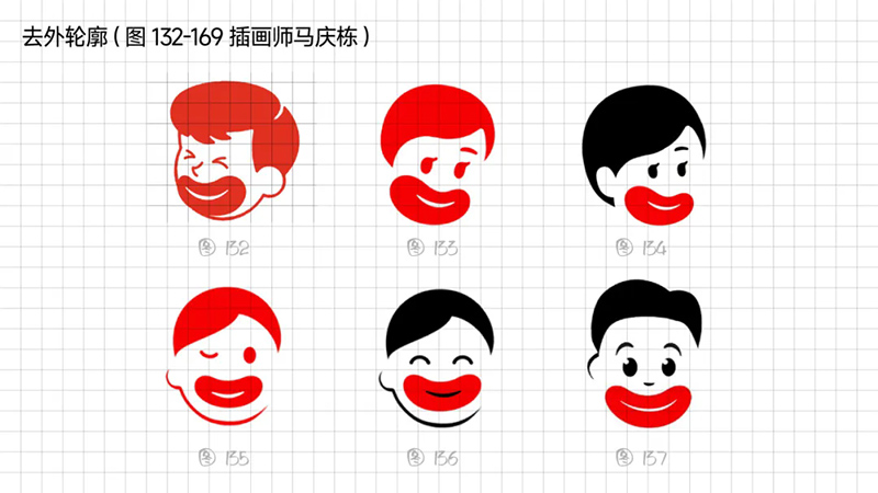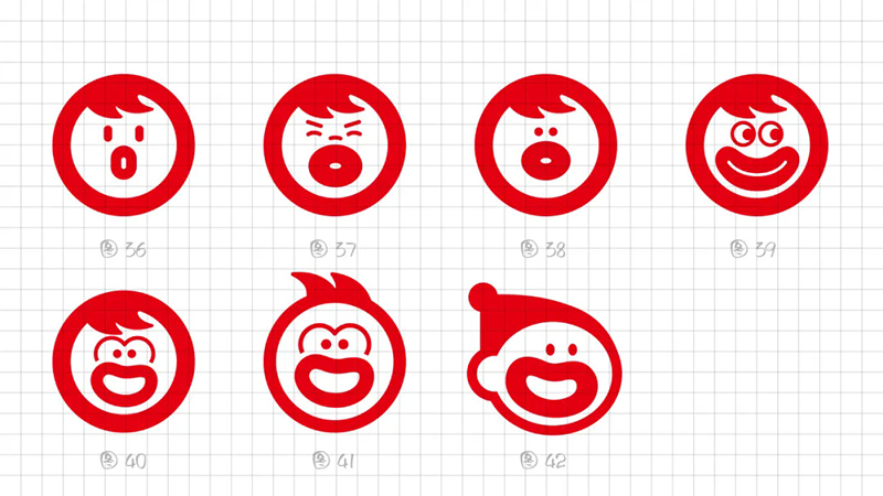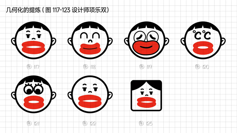 3) Geometric refinement: The eyes, eyebrows, and nose are reduced to a single cup, and when used as monochrome, many details will be blurred, resulting in a greatly reduced final presentation effect. Further simplify the individual elements in the symbols, refine the facial features, remove eyebrows, nose, hairstyle details, and summarize the face into a standard circle. At the same time, it was found that this handling technique gives people a sense of distance, lacks grounding, and lacks a bit of familiarity. Refining and simplifying also require mastering a balance.