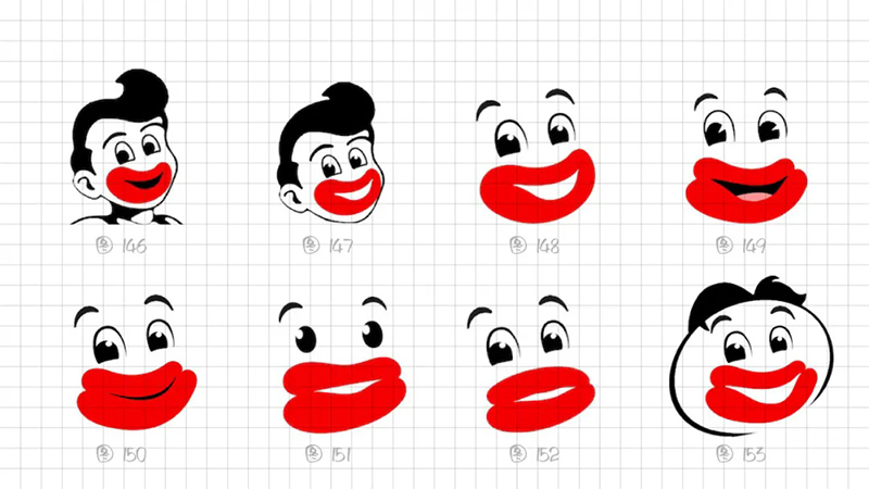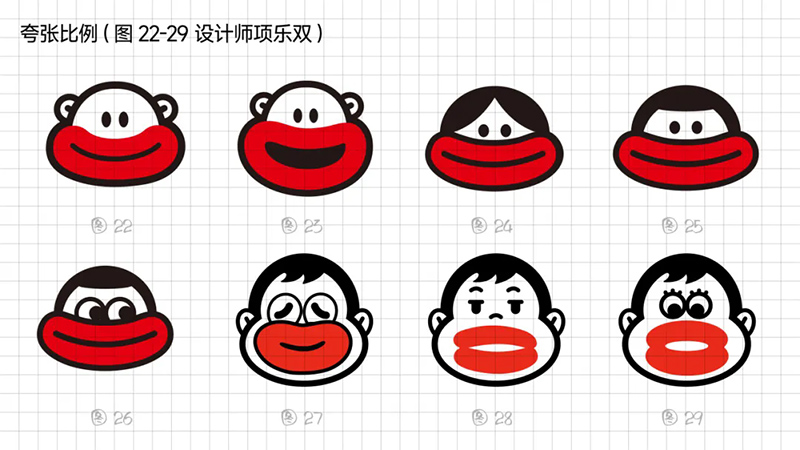 1) Exaggerated proportion: In planar composition, specificity is a technique of expression that enhances recognition and uniqueness. Seizing the characteristic of the sausage mouth with a large facial proportion, we try to magnify the lip contour to the extreme, exaggerating it to be even larger than the face.