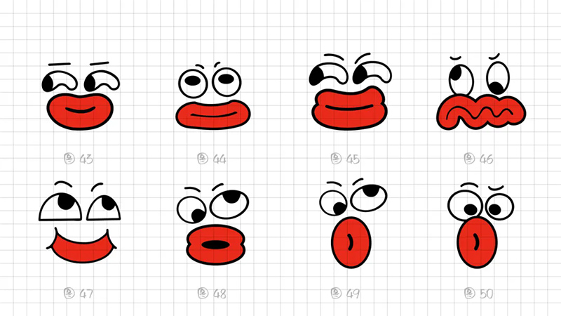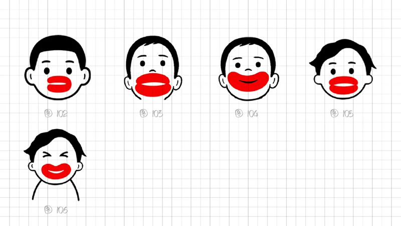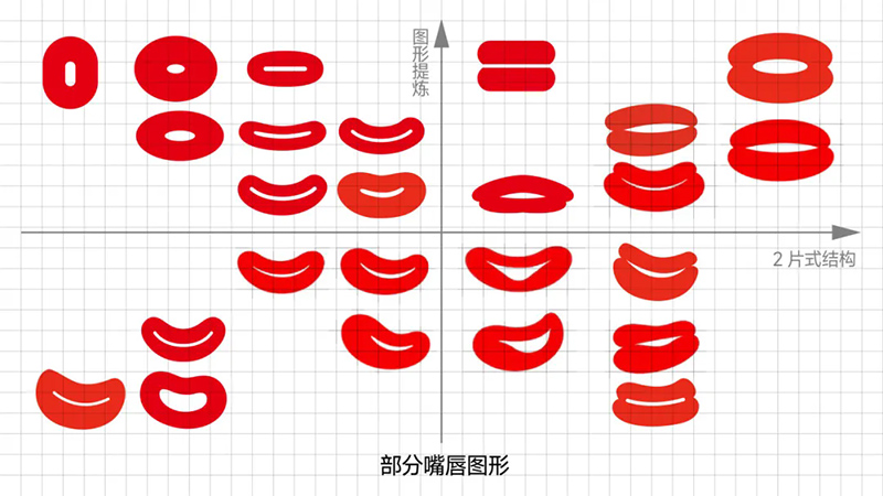 5) Extraction of lip shapes: Through different attempts at realism, summarization, refinement, and transformation, we have reorganized and reviewed the simplified shapes of the lips, which are mainly divided into two types in terms of composition: whether they are two ellipses or a transformation of three ellipses (as shown in the figure below).